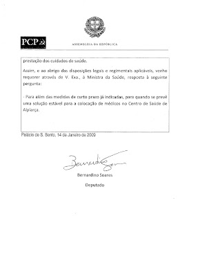 Entretanto convém recordar que o PCP através do deputado Bernardino Soares já em Janeiro questionara o governo sobre a situação da falta de médicos no centro de saúde de Alpiarça, sendo que esta pergunta foi feita na sequência de uma resposta inconclusiva do governo a uma pergunta já anteriormente formulada. Claro que nunca houve qualquer resolução do assunto.